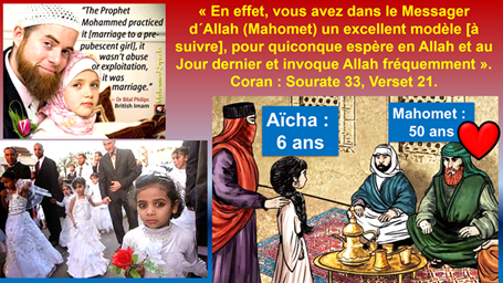 À 51 ans il épousa sa fiancée enfant Aïcha âgée de 6 ans. À 54 ans il viola son épouse enfant Aïcha alors âgée de 9 ans. (Bukhari 7, 62, 88)