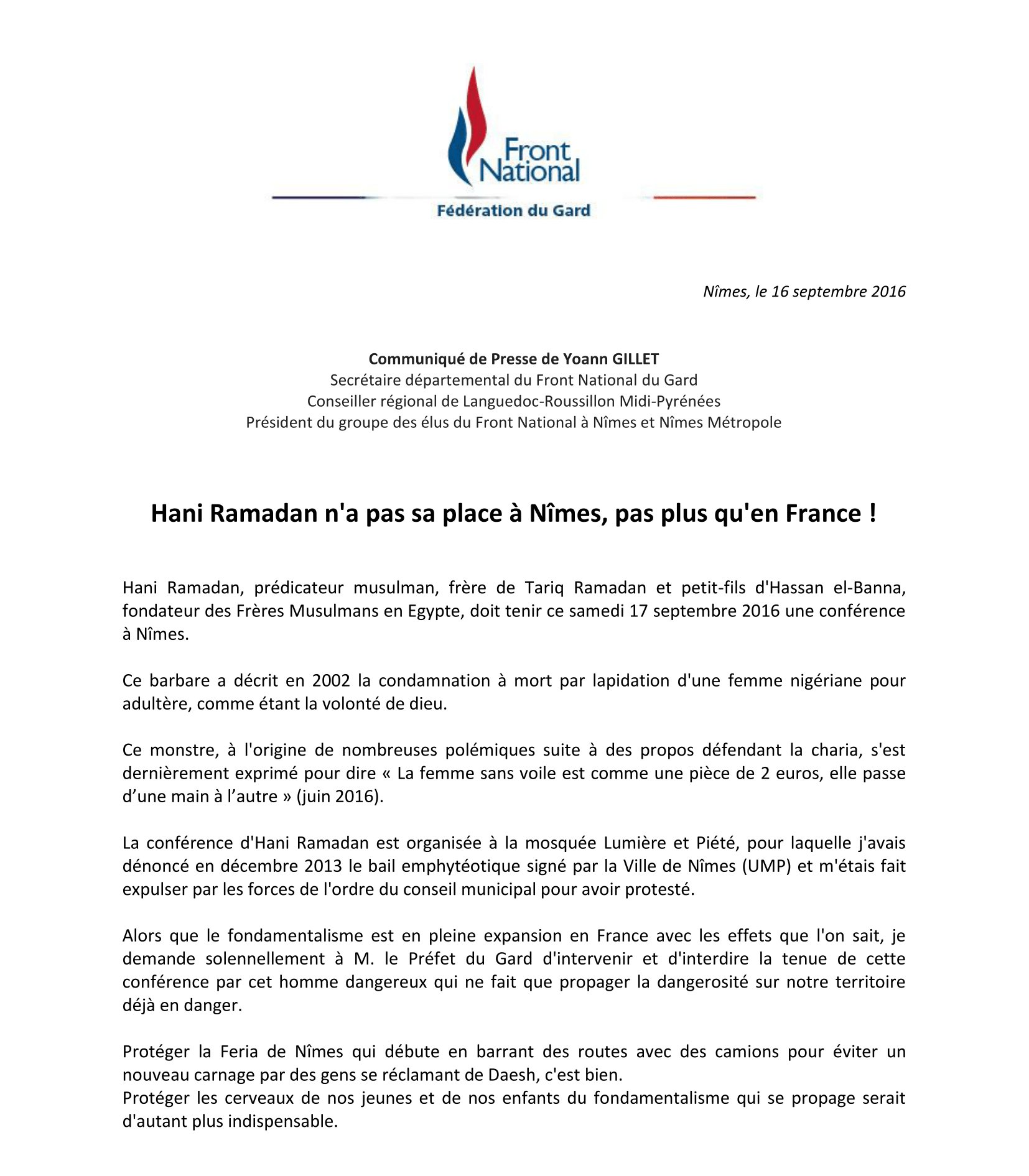 Superbe communiqué du FN du Gard qui a débouché sur l’interdiction de la « conférence », prévue à Nîmes ce samedi 17 septembre 2016, du pithécanthrope Hani Ramadan.