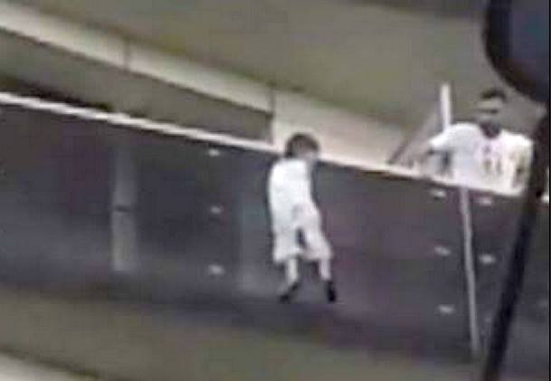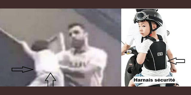 Ceci dit, en regardant les images, on peut remarquer, si ma vue ne me trompe pas que l’enfant se retient d’abord à la 13ème seconde par le bras droit ; puis à la 16ème par le bras gauche ???? Mais là, certainement que l’enfant est appuyé sur quelque chose ; très étonnante cette coïncidence d’un repose pied et plus encore à la taille.