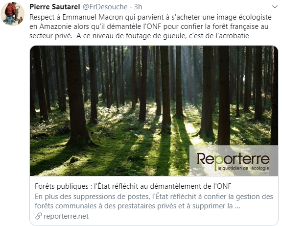 Macron ment comme il respire pour mieux tromper les Français. Après la signature des accords commerciaux de libre-échange avec le Canada (CETA) et l’Amérique du Sud (Mercosur) qui vont faire venir de milliers de kilomètres sur des cargos polluants des produits parfois toxiques ou dangereux, il vient faire la morale à Bolsonaro sur les incendies de la forêt amazonienne ou nous bassine avec le réchauffement climatique en utilisant la marionnette Greta pour justifier de nouvelles taxes.