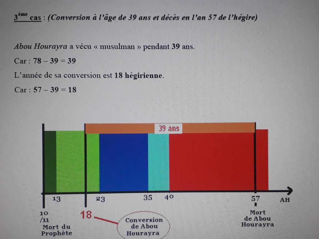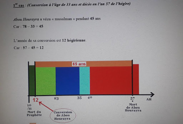 Cependant, si le prophète est décédé en l’an 10/11 de l’hégire et que Abu Huraira selon les différentes versions, vécut entre 75 et 78 ans et décéda entre 57 et 60 de l’Hégire, alors en quelle année hégirienne s’est-il converti à l’islam ? Réponse en image de M. Bouhandi: