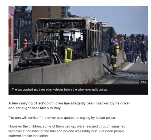 « Un bus transportant 51 écoliers a été attaqué par son chauffeur et incendié près de Milan en Italie. « Personne ne survivra », a dit le chauffeur d’après la police. Pourtant les enfants, dont certains avaient été ligotés, ont pu être secourus à travers les fenêtres brisées à l’arrière du bus et aucun n’a été sévèrement blessé. Quatorze enfants ont souffert à cause des inhalations de fumée. »