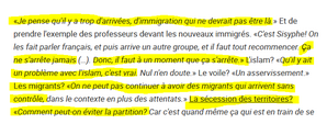« Nous fermerons les frontières, nous suspendrons l’immigration, nous reconduirons les clandestins d’où ils sont venus. Et surtout nous réserverons les prestations sociales aux nationaux. (…) L’islam n’apparaît pas conforme à nos fondements sociaux et semble incompatible avec le droit français. (…) C’est à l’islam et à lui seul de s’adapter afin d’être compatible avec nos règles. »