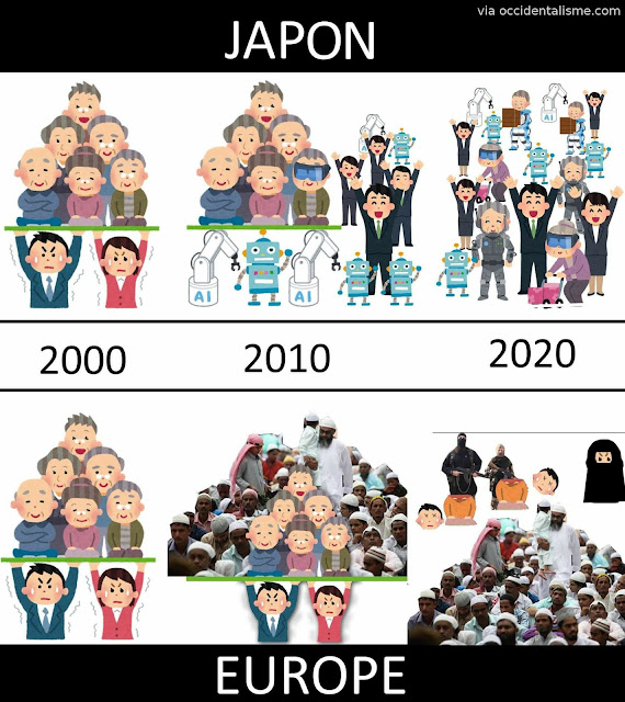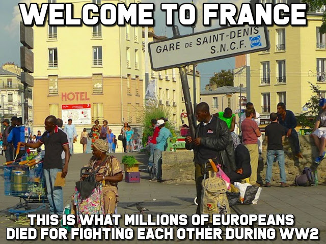 Cet « article » est plutôt une juxtaposition d’images, de citations et de mèmes sur le thème de l’invasion migratoire que connaît l’Europe depuis 40 ans et qui menace de la détruire complètement dans les prochaines années, si rien n’est fait pour engager l’expulsion massive vers leurs pays d’origine de la très grande majorité des colons noirs, maghrébins et orientaux, qu’ils soient de culture arabo-musulmane ou non.