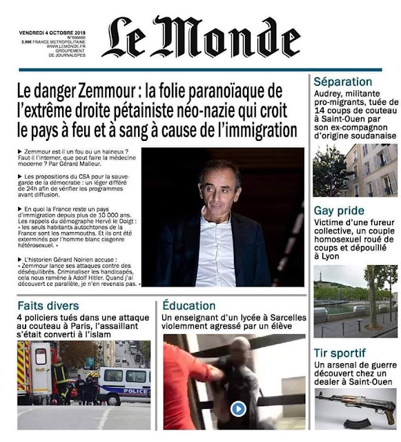 Parodie (à peine exagérée) du journal Le Monde et de sa propagande anti-France, et en faveur du grand remplacement. Tous les faits divers qui encadrent l’article en Une sur Zemmour sont réels et récents (moins de deux semaines).