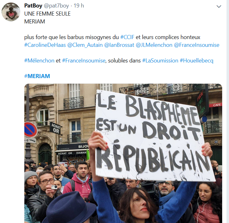Sur le compte twitter des FEMEN, les gens ont l’air de préférer et d’encourager Meriam, celle qui n’a pas froid… aux yeux, celle qui brave les islamistes plutôt que les catholiques à la messe à Notre-Dame-de-Paris (tiens, la cathédrale ayant brûlé, elles sont heureuses maintenant, les FEMEN ?).