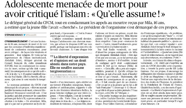 Vu l’avancée du problème, et sa rapidité, ça nous pend au nez !… Alors, par sécurité, le « coming-out » devient sacrément risqué. Pour vivre heureux (et en bonne santé…) vivions cachés, surtout dans le domaine des mœurs… N’oublions jamais que l’ennemi n’a aucune tolérance, ni humanisme inclus dans son dogme ! En outre, il ne semble pas que les assoces LGBT ou féministes aient trop plaidé la cause de Mila, un silence assourdissant en fait, ils ne peuvent pas tout faire, ils sont déjà islamo-compatibles, c’est lourd à porter !…
