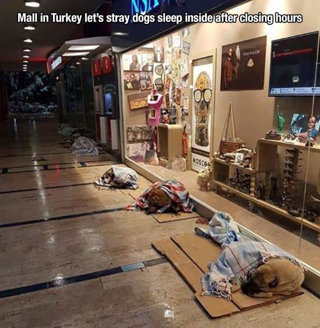 En Turquie, un centre commercial laisse les chiens errants dormir à l’intérieur après la fermeture.