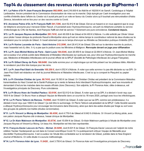 – Karine Lacombe avait accusé le professeur Raoult de donner aux Français un faux espoir de guérison » et d’être « en-dehors de toute démarche éthique“, elle qui avait palpé 212.000 Euros de divers laboratoires dont Gilead pour recommander le Remdesivir, médicament de Gilead inefficace et fortement toxique. Lire : „COVID-19 – Remdesivir: permis de tuer. Hydroxychloroquine: interdiction de guérir“ et L’OMS déconseille le Remdesivir : « Un scandale innommable »