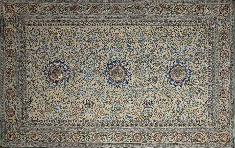 Tapis de perles, réalisé en Inde, vers 1865, pour le maharajah de Baroda, il devait être offert pour couvrir le tombeau du Prophète Mahomet. Composé de 1,5 à 2 millions de perles, 2.500 diamants taillés en rose, plus de 1.000 rubis et 600 émeraude, il est venu enrichir les collections du Musée national du Qatar. (Dimensions 264 X 173 cm).
