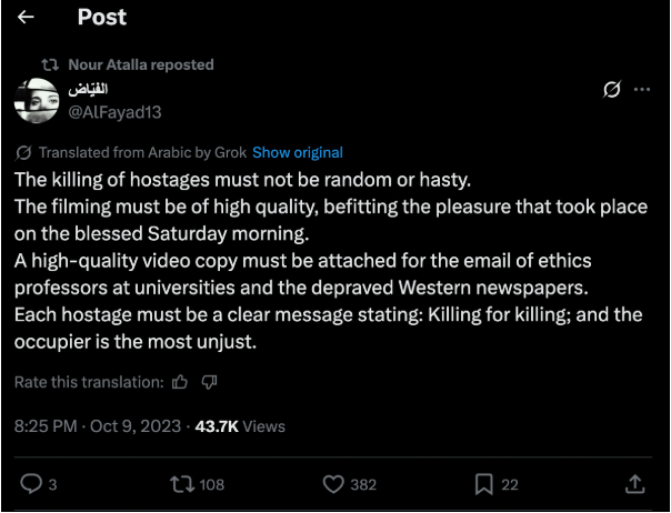 L’affaire a pris un nouveau tournant ce mercredi lorsque plusieurs médias ont exhumé d’anciennes publications, attribuées à la jeune femme, sur le réseau social X. Le 9 octobre 2023, deux jours après le sanglant assaut du 7-octobre par les militants du Hamas, Nour Atallah relayait un post appelant à filmer les exécutions des otages en «haute qualité» et à les envoyer aux médias «de l’Occident pervers».