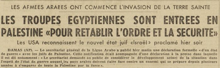 Mais relégué en petit, à droite sur la première page, il est facile de le rater. Notez, cependant, que « les forces arabes entrent en Palestine », ça veut bien dire ce que ça veut dire : les troupes arabes sont entrées en Palestine, combattre la Palestine juive.