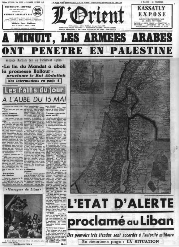 Séisme au Moyen-Orient. David Ben Gourion, le président du Conseil national juif, proclame la naissance de l’État d’Israël. Nous sommes le 14 mai 1948. Le soir même, les armées arabes pénètrent en Palestine. La première guerre israélo-arabe dure dix mois. Elle fera des dizaines de milliers de victimes arabes. « Le passé est mort à minuit », écrit le rédacteur en chef de L’Orient, Kesrouan Labaki, en poste depuis quatre ans. Les Arabes sont commotionnés par la nouvelle. Pourtant, on le pressent dans ces lignes, le malaise est déjà ailleurs. Au Liban, les tensions couvent entre « les plus chauds partisans de la cause arabe » et les autres. Que les Libanais « s’appliquent à maintenir un climat d’unanimité nationale », implore Labaki.