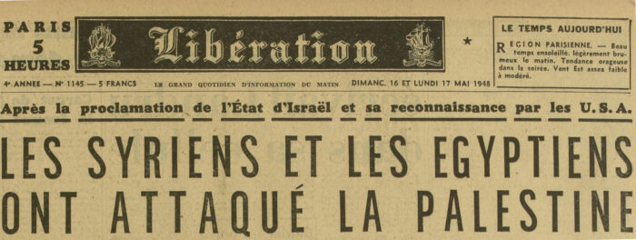 Je republie à intervalle régulier la Une de l’Intransigeant du 15 mai 1948, ci-dessus en tête de l’article, dont le titre a fortement énervé mes confrères révisionnistes et négationnistes de l’histoire du peuple juif en Judée, en Samarie, à Jérusalem et plus généralement sur sa terre ancestrale nommée Palestine (Sous l’Empire romain, après la révolte juive de Bar Kokhba (132-135 ap. J.-C.), l’empereur Hadrien renomme officiellement, pour la première fois, la province de Judée en « Syria Palaestina »).