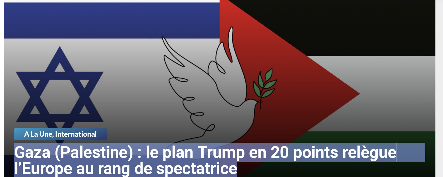 En effet, non seulement les Européens ont montré leur impuissance, mais ils ont démontré et leur sottise et leur collaboration, ils ne sont bons qu’à accueillir chez nous des fanatiques, des terroristes en puissance et en continuant, cerise sur le gâteau, à financer, à nos dépens, des antisémites qui ne vivent que pour que crève IsraËl.  Bref, Trump organise une paix provisoire qui va libérer encore des centaines de terroristes, libres de recommencer à creuser des trous sous les écoles et hôpitaux de Gaza… Et on ne parlera pas de son projet ridicule de faire de Gaza un paradis pour milliardaires…