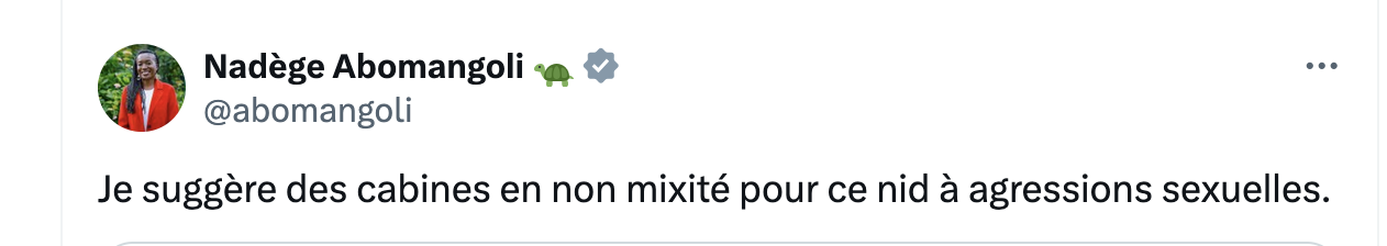 Eu égard à la taille des cabines, ça va être commode de trier et de faire des cabines réservées aux hommes, d’autres aux femmes… Et le non binaires, alors, Nadège ? On fait quoi avec ? Et pour les hommes qui violent ds jeunes hommes, on fait quoi ? On interdit les cabines aux moins de 30 ans ? Et les hommes qui ont changé de sexe mais qui ont gardé leur force d’homme (il y en a pas mal dans certaines compétitions sportives, paraît-il…) )