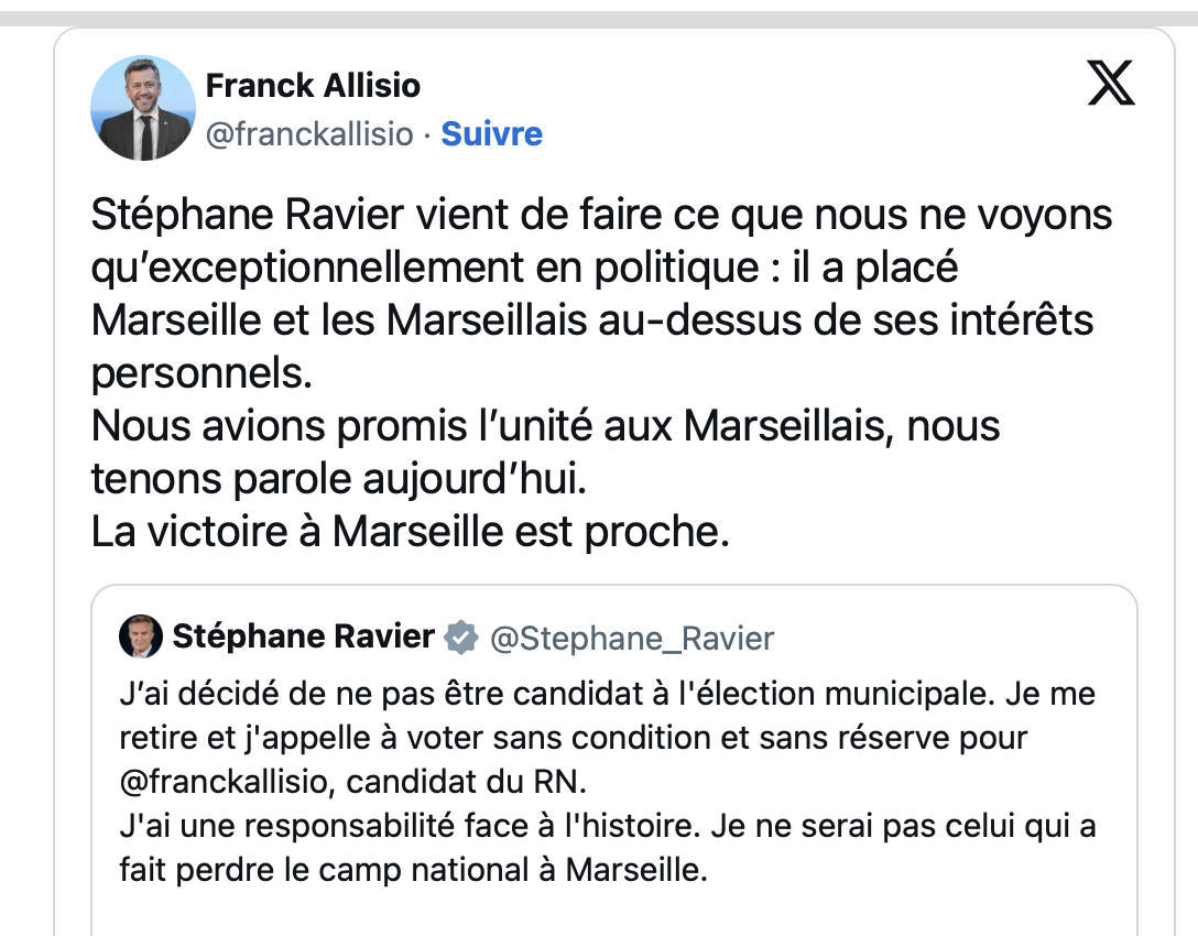Il retire sa candidature à la Mairie afin de ne pas faire perdre le camp patriote. Il y a peu de militants comme ça, qui font passer l’intérêt du parti/du pays avant le sien propre.