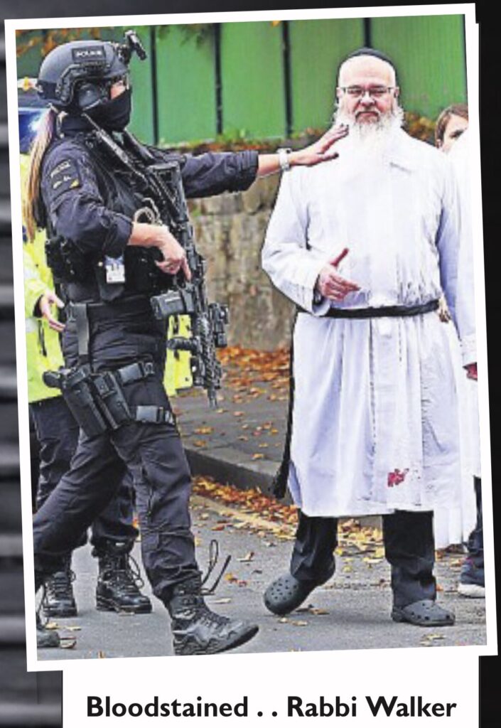 À l’intérieur de la synagogue, le service était dirigé par Daniel Walker, le rabbin qui a sauvé sa congrégation en barricadant l’intérieur. Sur les images publiées sur les réseaux sociaux, on le voit vêtu d’un kittel, la robe blanche traditionnelle portée pendant les jours fériés, maculée de sang. L’une des victimes était un agent de sécurité (si le multiculturalisme est si merveilleux, pourquoi toutes les synagogues d’Europe occidentale sont-elles protégées par la police et des agents de sécurité ?).