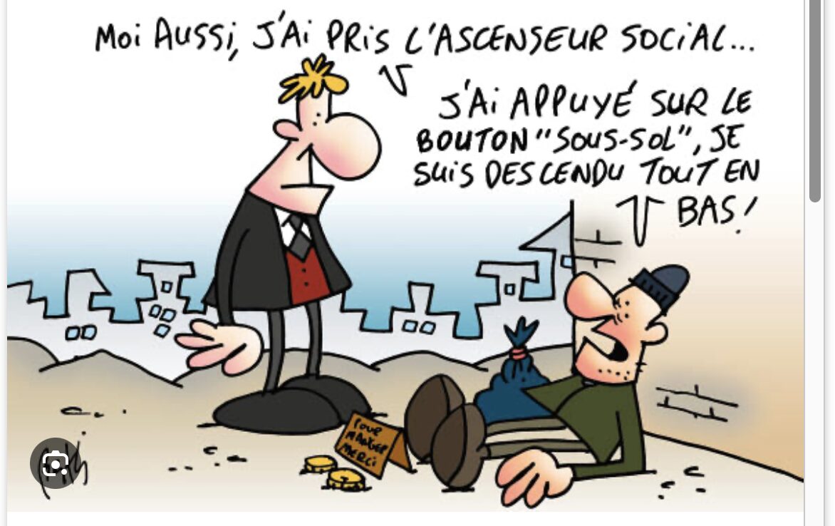 Des qu’on associe l’adjectif « social »à un nom, on se retrouve avec une aberration. Il n’y a pas d’ascenseur social. Il n’y a que votre volonté de vous en sortir. Qu’a fait la société pour vous aider, à part vous faire bénéficier de l’école gratuite?