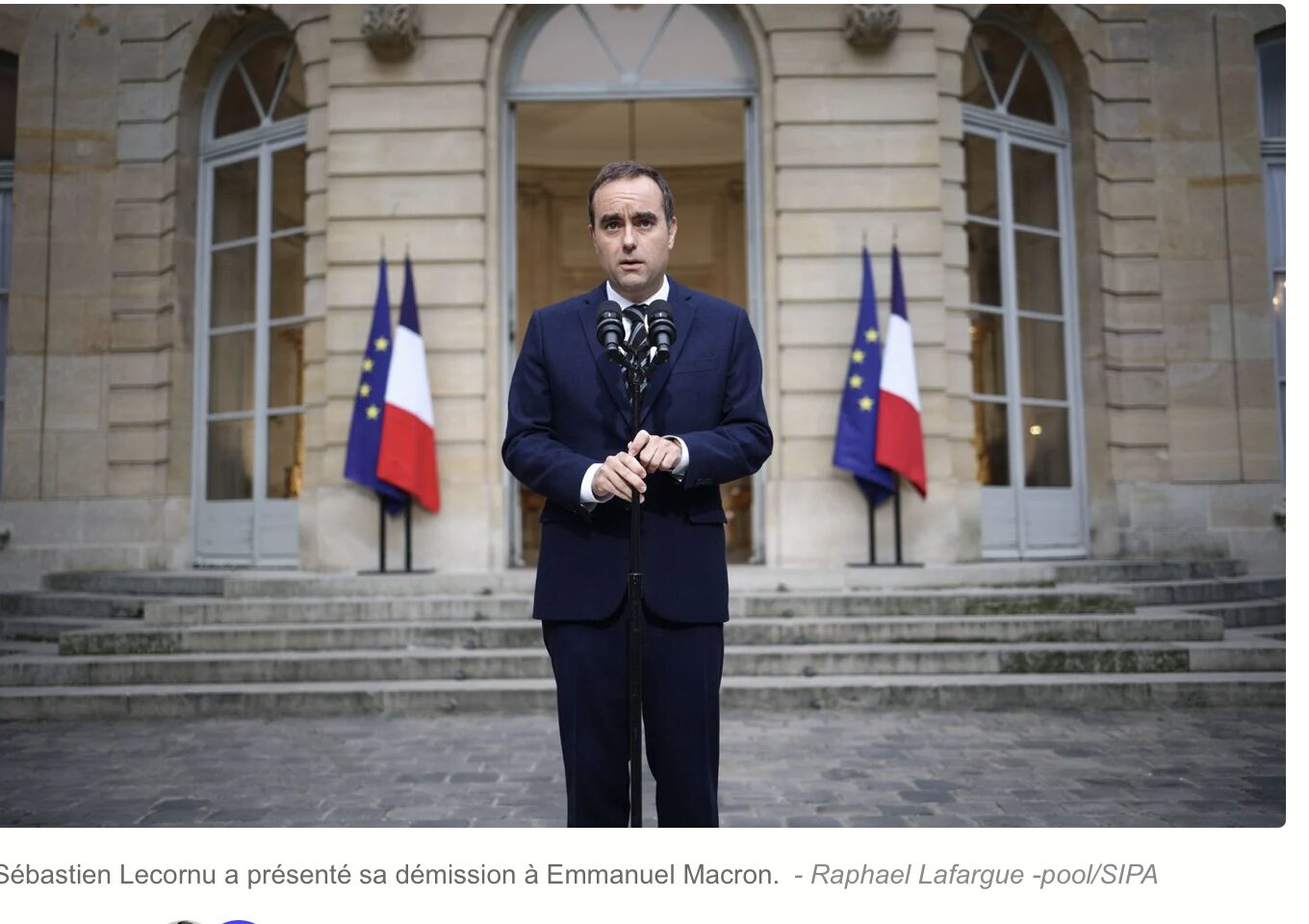 Non,ce n’est pas triste pour la France: M.Lecornu,qui semblait très à l’aise en compagnie d’un Benalla en survêtement et baskets pour nier le connaître personellement peu après,prend la porte! Je ris aux éclats à la veille du 7 octobre et cette année ,de la fête juive de Souccot. Que le 7 octobre redevienne un symbole de victoire de l’Occident et des nations libres sur les empires,celui des mondialistes et de l’Islam Conquérant!Pour commencer,que M.Macron