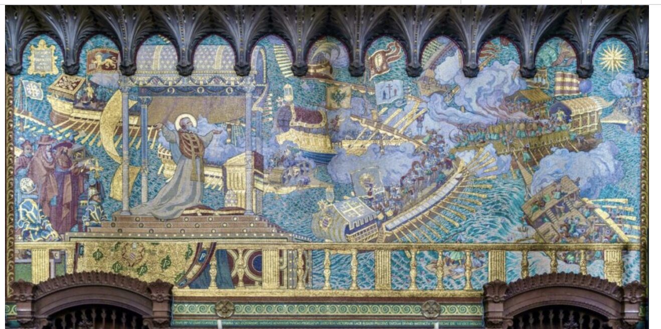 La Sainte Ligue avait été voulue par le Pape Pie V – en prière sur la mosaïque – à la suite du massacre par les Ottomans de 20 000 chrétiens de Nicosie (Chypre).
