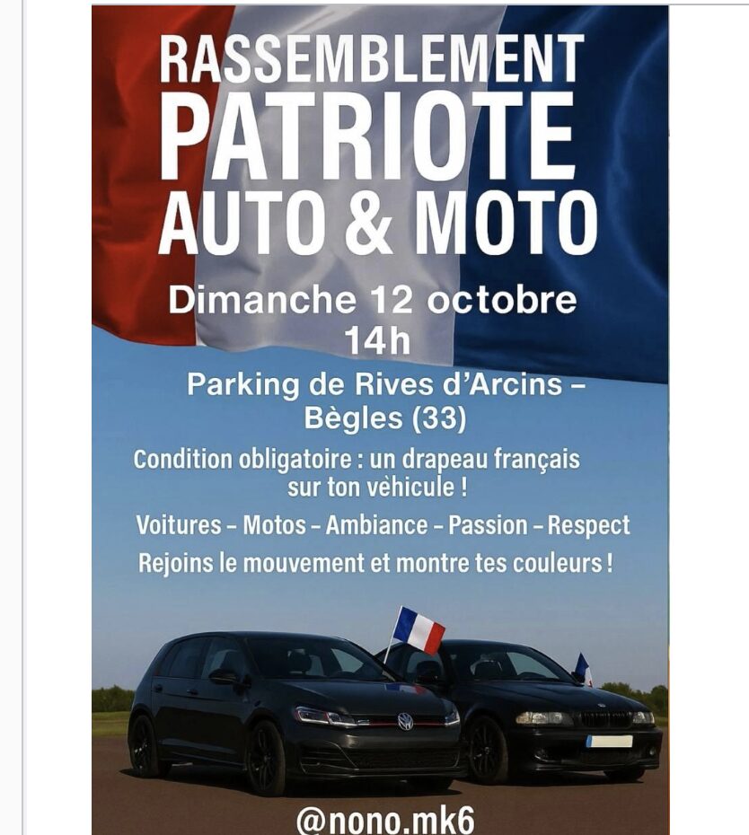 Il semble qu’il y ait pas mal d’initiatives locales, comme celle-ci à Bordeaux, qui a l’air également fort intéressante, un rassemblement d’autos et de motos ça devrait avoir de la gueule… et faire vibrer notre camp. Merci à Jean-Paul Saint-Marc pour l’info :