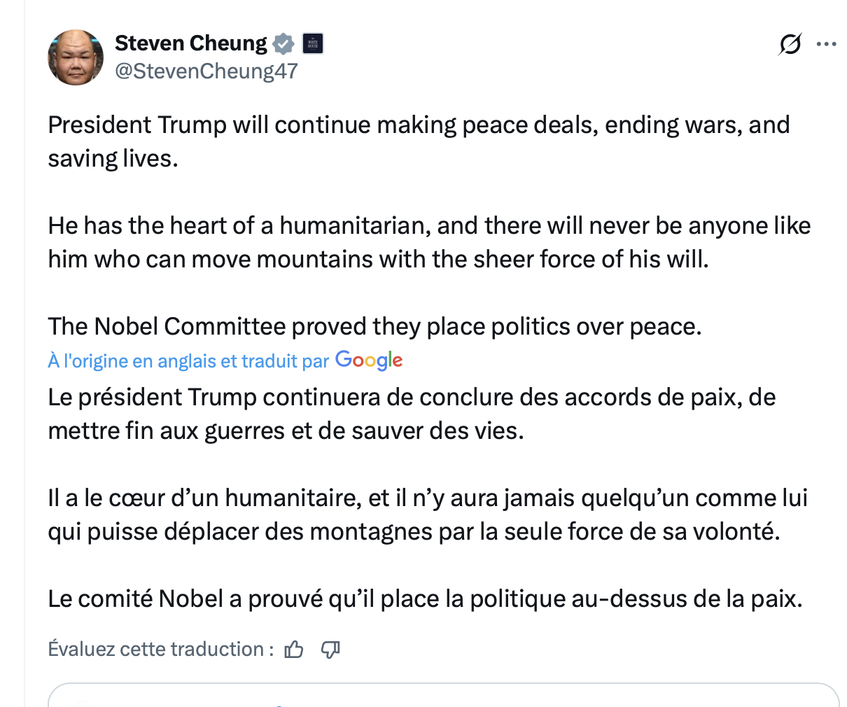 Le communiqué de la Maison-Blanche en réaction à l’attribution du prix à Maria Corina Machado s’est voulu moins empreint de sollicitude, reprochant au comité d’avoir fait passer «la politique avant la paix». «Le président Trump continuera à conclure des accords de paix, à mettre fin aux guerres et à sauver des vies. Il a un cœur humanitaire, et personne d’autre que lui ne sera jamais capable de déplacer des montagnes à la seule force de sa volonté», a réagi le directeur de la communication de la Maison-Blanche, Steven Cheung, sur X.