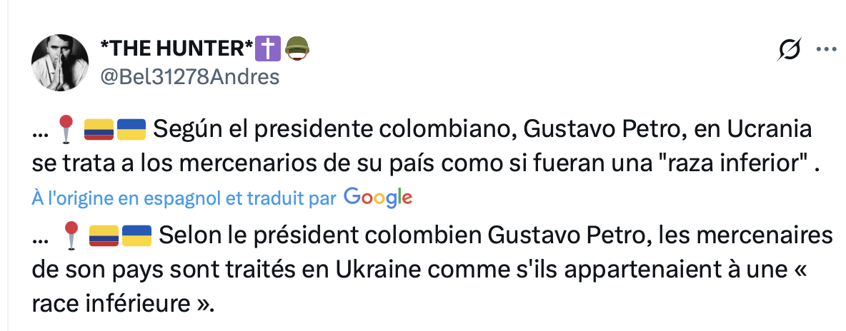 En attendant la guerre continue, les Ukrainiens meurent. Ils sont obligés de recruter des mercenaires, dont des Colombiens, qui se plaignent aujourd’hui d’être traités comme une race inférieure, comme le rapporte leur Président, Gustavo Petro, en personne, qui exige des autorités ukrainiennes de les rapatrier manu militari.