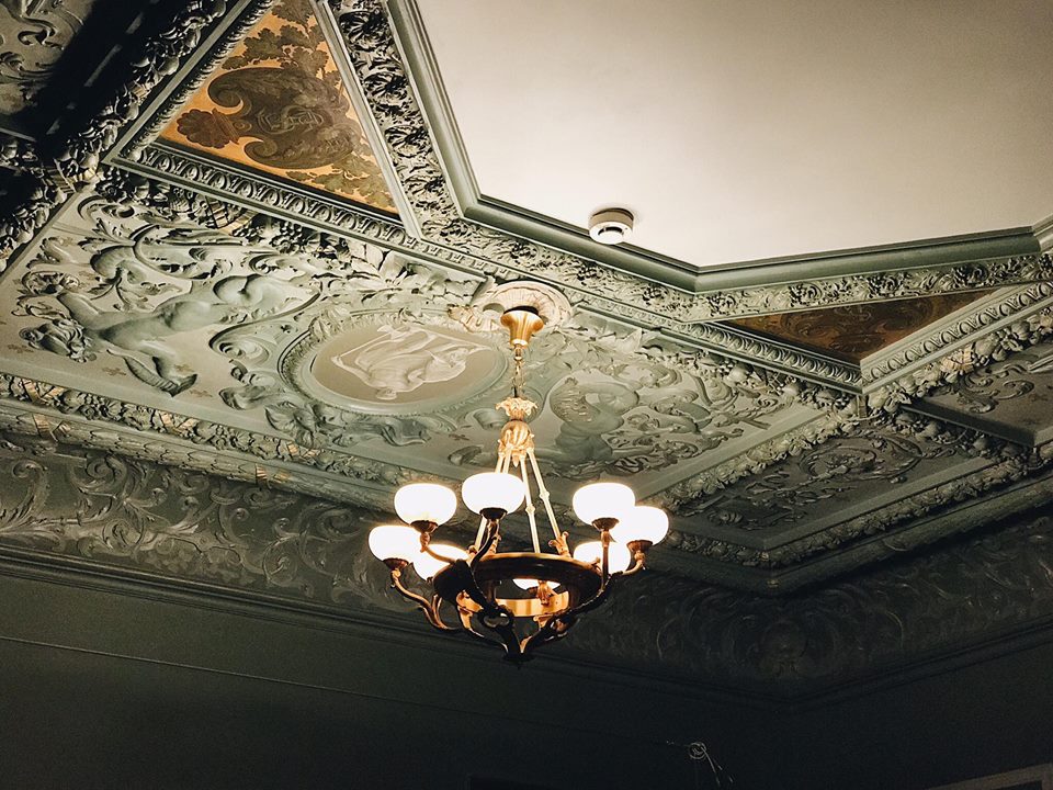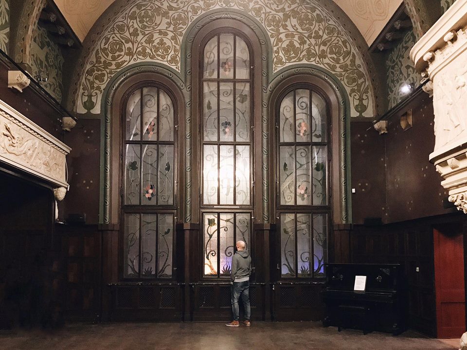 L’intérieur est somptueusement décoré avec huit pièces chacune dans un style différent : par exemple, la salle romane est ornée de chêne des tourbières, de motifs celtiques sous le plafond et d’un bas-relief chevaleresque, tandis que la salle classique évoque la fin de la Renaissance avec une cheminée en marbre vert et des images mythologiques au plafond. Cette demeure est un bel exemple d’architecture d’avant-garde pour son époque, mêlant modernité et riche inspiration historique.