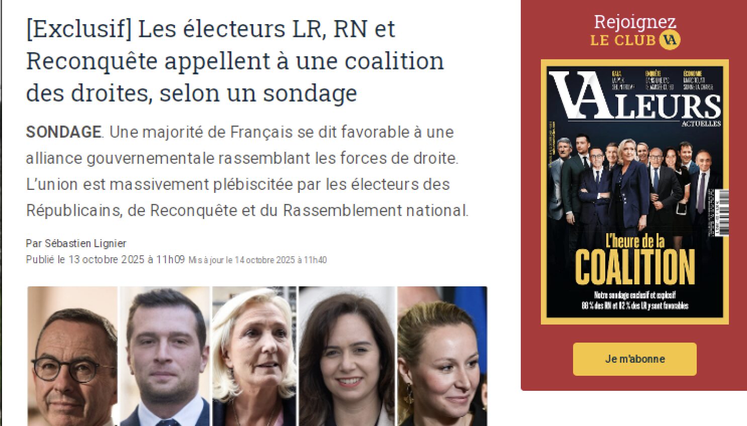 « Selon un sondage Ifop pour Valeurs actuelles, ils sont 52 % à se dire favorables à une coalition gouvernementale incluant Les Républicains, le Rassemblement national et Reconquête. »