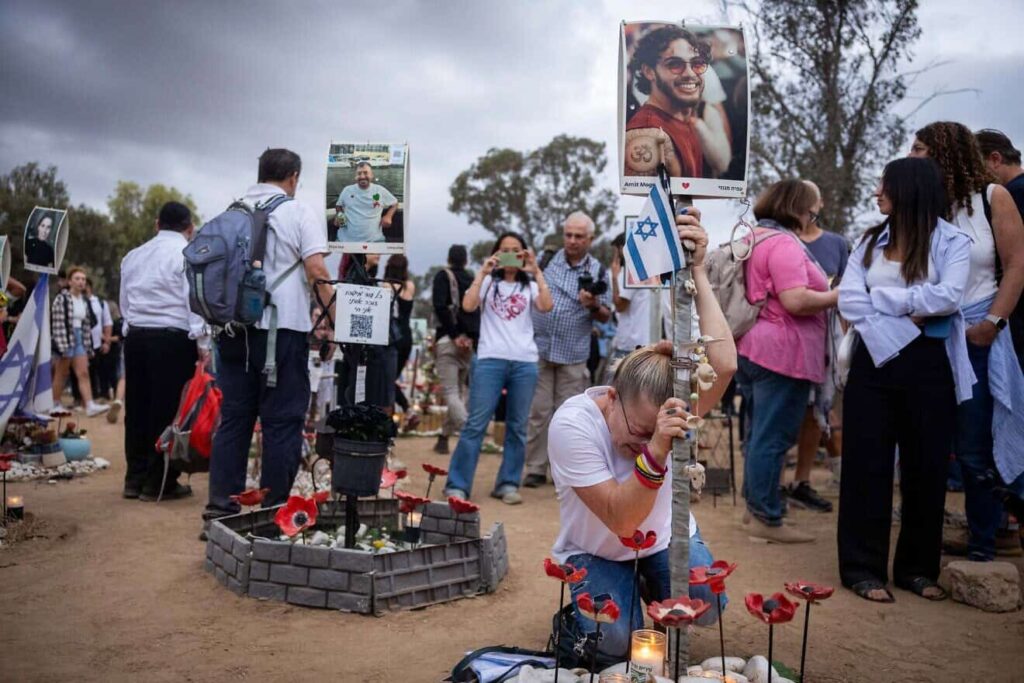 Les amis et la famille des victimes du massacre du festival de musique Supernova se rassemblent sur le site près du kibboutz Re’im le 7 octobre 2024