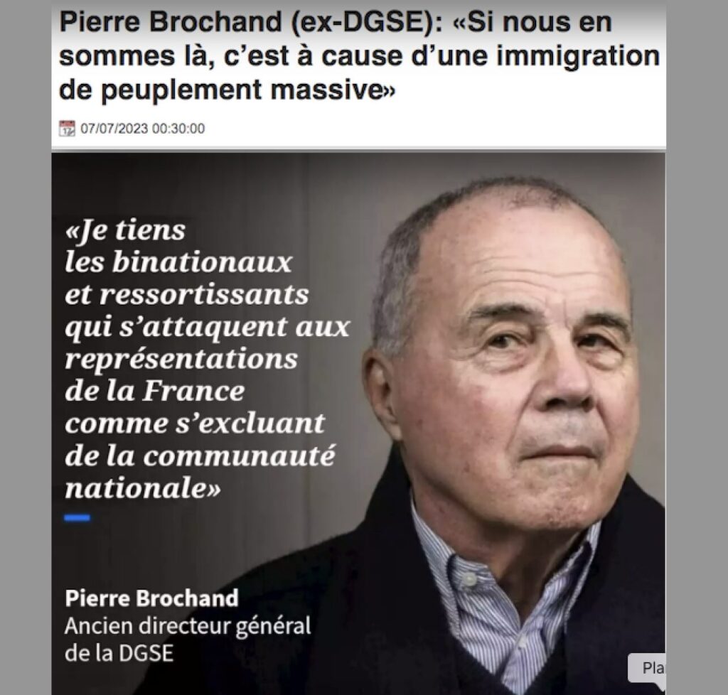 Celui qui alerte mais que peu de responsables politiques entendent, c’est Pierre Brochand, haut fonctionnaire qui fut directeur général de l’importante… -pour le bien-être de chacun d’entre nous !- …Direction Générale de la Sécurité Extérieure, donc de la DGSE ! Et cela de 2002 à 2008. Voilà la référence in-con-tes-ta-ble pour cet homme de 84 ans… -homme qui fait partie de ma génération si injustement décriée même par des politicards de pacotilles, c’est-à-dire « de très mauvaise qualité et sans valeur » (Le Robert), souvent jeunes et qui pensent nous rabaisser en osant nous traiter ironiquement de « boumeurs » (je préfère le terme québécois à l’anglicisme « boomer ») alors que ces générations plus jeunes passent leur temps avec, en mains, les outils informatiques nés sous notre génération…- référence qui fait de Pierre Brochand l’un des plus lucides sur les dangers qui menacent l’existence même de NOTRE FRANCE en tant qu’État !
