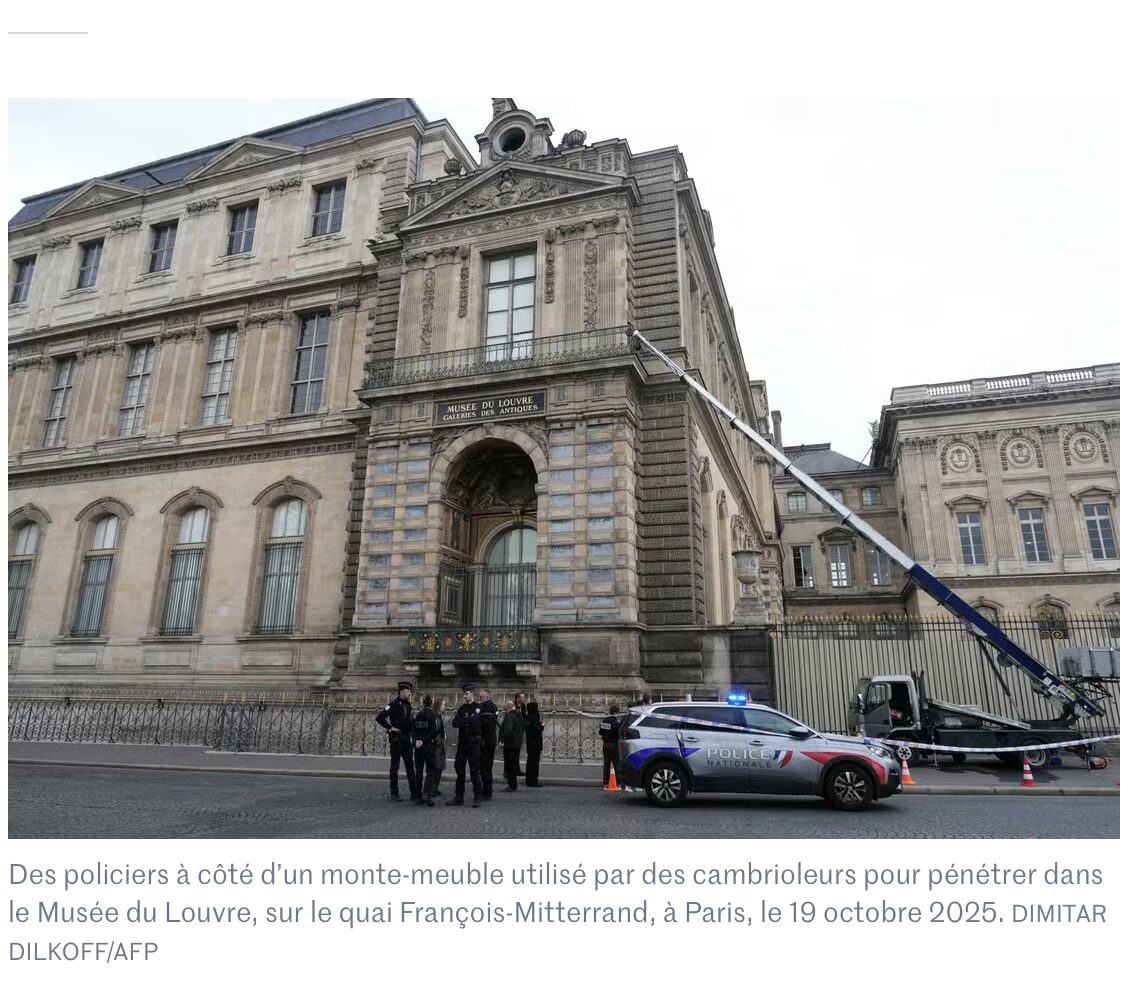 Le casse du siècle ? C’est ce que dit Le Parisien.. On n’avait pas vu ça depuis 1911 ! En ce lundi 20 octobre, on revient évidemment sur l’incroyable braquage qui s’est déroulé au Louvre, hier matin. Non, il ne s’agissait pas du tournage de « Cat’s Eye » ou de « Lupin » mais de vrais malfaiteurs qui ont raflé un butin inestimable en quelques minutes. Le plus grand musée du monde n’avait pas connu ça depuis le vol de la Joconde en 1911 !