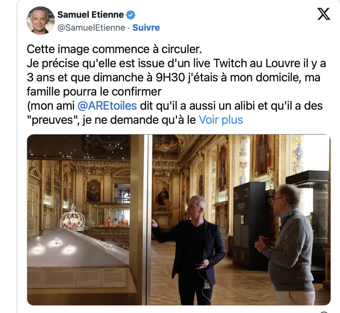 «Je précise qu’elle est issue d’un live Twitch au Louvre il y a 3 ans et que dimanche à 9H30 j’étais à mon domicile, ma famille pourra le confirmer», poursuit-il avec humour dans son poste X avant de citer un de ses confrères de la plateforme : «Mon ami AREtoiles dit qu’il a aussi un alibi et qu’il a des « preuves », je ne demande qu’à le croire». Ce dernier a également filmé le Louvre, et les bijoux volés, par le passé. C’était à l’occasion de la Nuit des musées. Les clichés ont vite été retrouvés par les internautes.