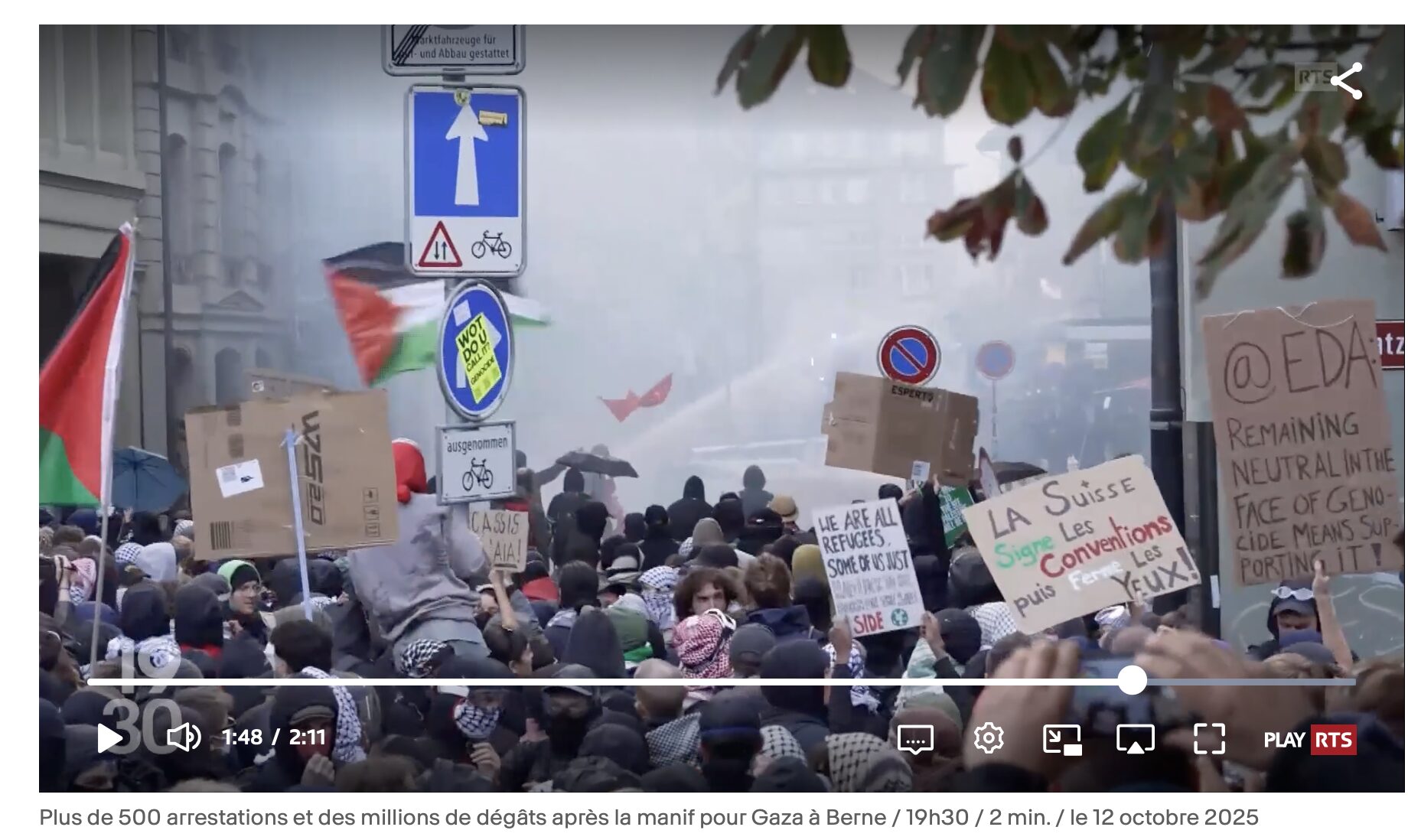 2. Ces manifestants ont donc porté atteinte à notre neutralité et se sont battus avec violence pour un peuple étranger (tout comme un Suisse parti à la Légion étrangère française va combattre en Ukraine pour la France ou un musulman de Suisse parti faire le djihad contre les chrétiens et les juifs au Moyen-Orient). Ces manifestants cachant leur visage ce qui est illégal, à Berne se sont rangés avec violence pour les musulmans de gaza et leur hamas qu’ils ont élu, contre le peuple d’Israel. Ils ont donc trahis pas seulement nos traditions démocratiques mais notre peuple suisse. Ce pourquoi ces manifestants et leurs meneurs doivent être arrêtés, jugés par la justice militaire, condamnés lourdement, doivent payer les millions pour les dégâts et s’excuser auprès des commerçants lésés et des policiers violentés .