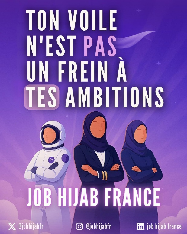 Trois meufs en hijab, une en scaphandre (astronaute, tu parles !), deux en tailleur de cadre sup, bras croisés comme des caïds de la charia, en position conquête de l’Occident et du monde des affaires. En bas : Job Hijab France. Et leurs comptes X, Insta, LinkedIn : @jobhijab.fr. Déjà 20 000 abonnés qui bavent sur des stories de « sœurs » qui « brisent le plafond de verre » … avec cette saloperie sur la tête et pour couronner le tout sur fond violet – la couleur du féminisme. Fallait oser ! Ben voyons ! Tout est bon dans le cochon ! On va pas se laisser enfumer par ces vendus de la diversité à géométrie variable !