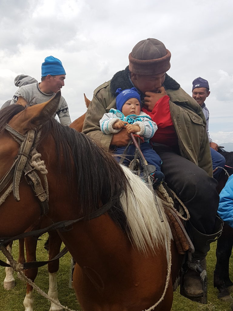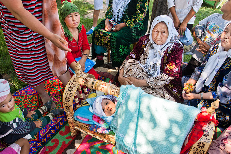 La cérémonie du beshik toy, lorsque l’enfant est installé pour la première fois dans son berceau traditionnel, marque son inscription dans la lignée familiale. Le baksy ou les anciennes de la famille récitent alors des formules protectrices qui placeront l’enfant sous la garde d’Umay et des ancêtres bienveillants.