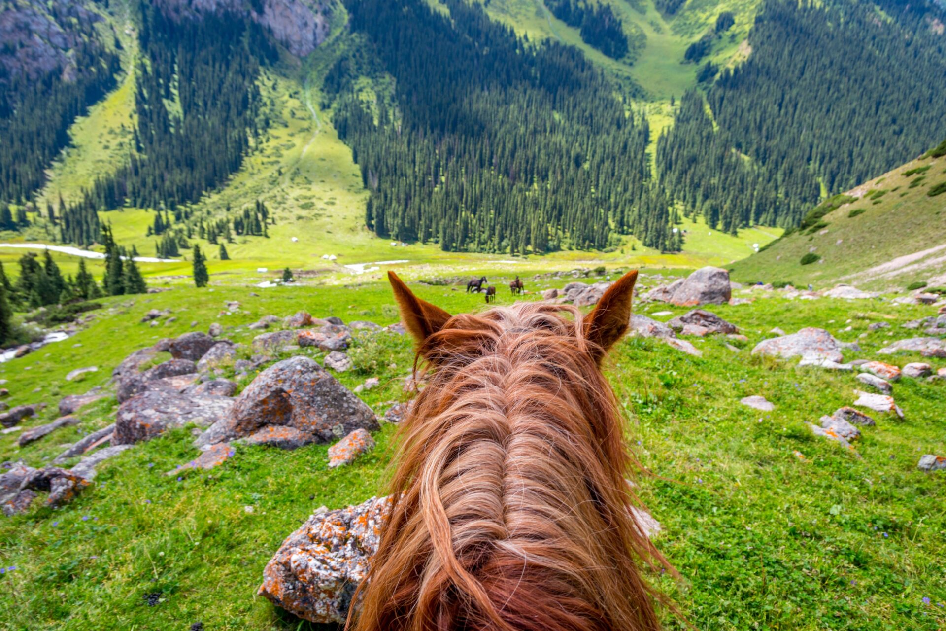 Les rochers dressés, les grottes mystérieuses, les tourbillons de vent qui surgissent sans prévenir dans la steppe : autant de manifestations d’une présence qui dépasse l’humain et l’enveloppe. Le nomade kirghize ne se sent jamais seul dans l’immensité ; il évolue dans un monde saturé de présences, certaines amicales, d’autres indifférentes, quelques-unes hostiles si on ne les honore pas correctement.
