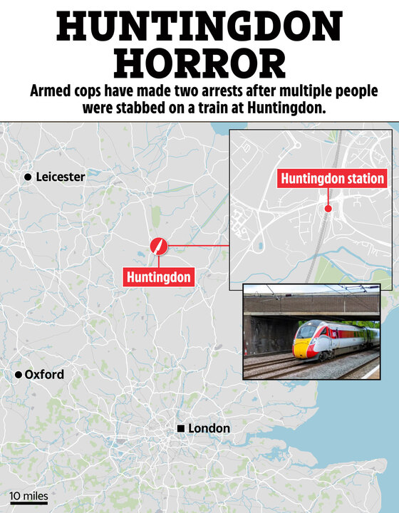 Plus de 30 policiers se sont précipités à la gare de Huntingdon, dans le Cambridgeshire, après l’arrêt d’urgence du train suite à des signalements de plusieurs attaques à l’arme blanche.