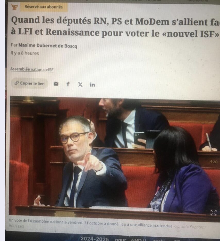 Un point de vue est aussi celui du Figaro qui, sous le titre… « Quand les députés RN, PS et MoDem s’allient face à LFI et Renaissance pour voter le «nouvel ISF» note qu’« Une alliance baroque de députés PS, RN et MoDem a approuvé dans la soirée une modification de l’Impôt sur la fortune immobilière (IFI) qui intègre les actifs financiers dans l’assiette de l’impôt, et en exclut la résidence unique ou principale, comme le souhaite de longue date le RN. »