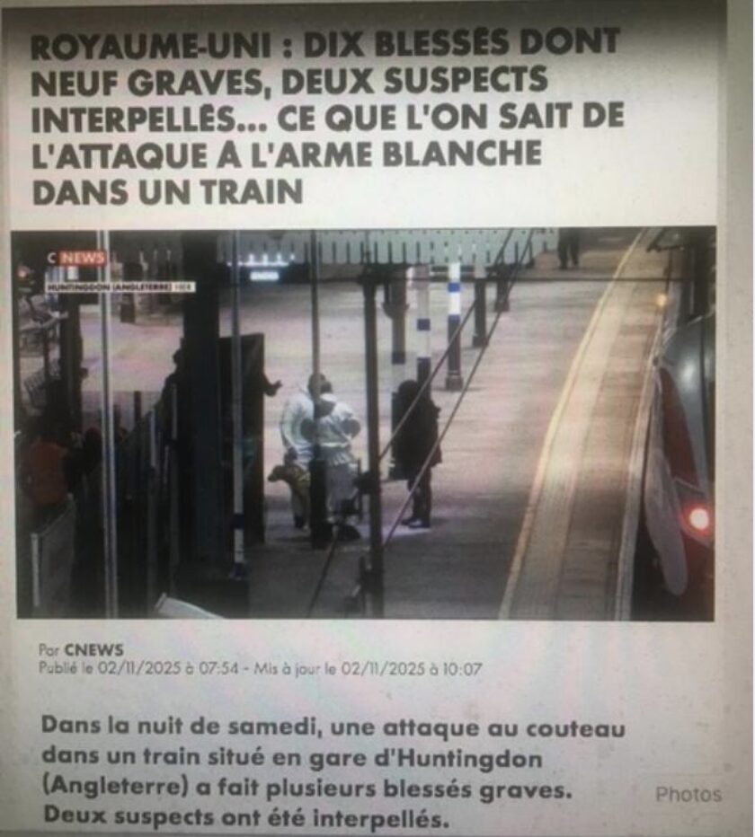 Après les agressions à l’aide de couteaux perpétrées samedi par deux hommes contre dix passagers d’un train partant de Doncaster pour Londres, comment les autorités travaillistes, pourraient-elles parler d’attentats » en ce si doux et si cher Royaume « désUni » de ce non moins cher Roi Charles de la famille Windsor, famille tout aussi désunie !