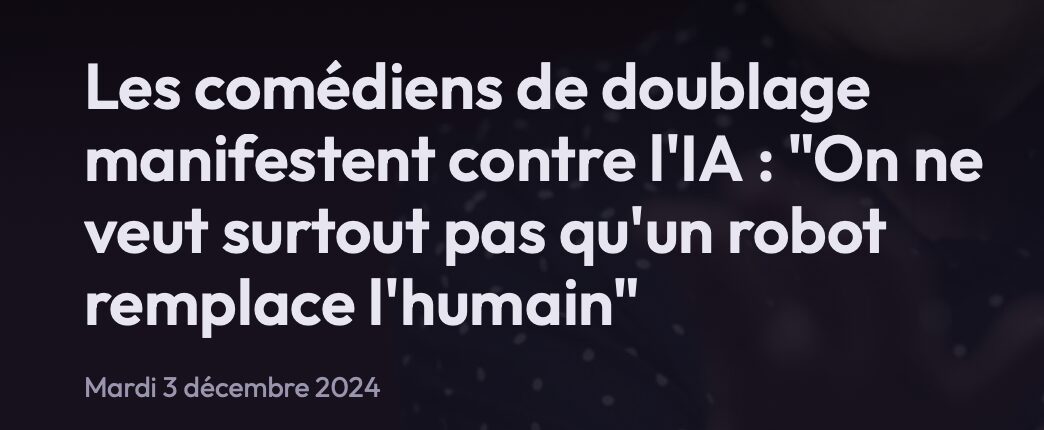« Touche pas ma VF, touche pas ma VF… » Ce hashtag, qui signifie « touche pas à ma version française », a été crée pour soutenir les doubleurs. Ils étaient environ 200, mobilisés derrière l’Opéra Garnier à Paris, place Diaghilev, pour défendre les droits des doubleurs de voix face à l’implantation toujours plus importante de l’Intelligence artificielle dans leur travail. Philippe Peythieu, voix française de Homer Simpson, soutient la cause : « Il y a un danger, on est là pour se défendre et pour demander que dans la convention collective, que dans nos contrats, on soit protégés et que ce soit une exception culturelle qui nous protège vraiment ». Véronique Augereau, voix française de Marge Simpson rajoute : « Nous on ne peut travailler qu’avec ce qu’on est, avec notre âme, donc avec l’humain. On ne veut surtout pas qu’un robot remplace l’humain, ce n’est pas possible« . Suite ici