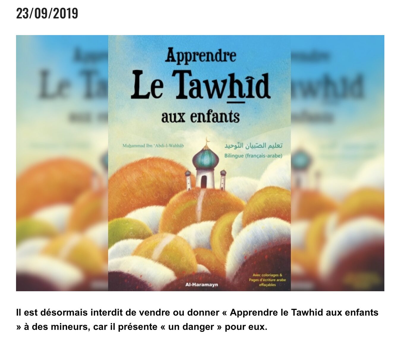 En 2019, est interdit à la vente AUX ENFANTS un livre d’apprentissage de l’islam car il dit textuellement que l’islam est le fait de prendre les musulmans comme alliés et les mécréants comme ennemis. Livre écrit par un théologien du wahhabisme, le prédicateur Mohammed ben Abdelwahhab.