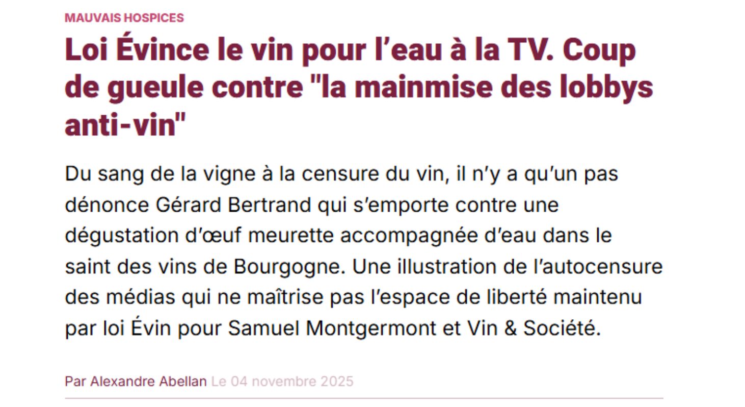 Ainsi, le porte-parole de la Congrégation de la Foi a-t-il officiellement déclaré: Le service public transforme le vin en eau ! » s’emporte le négociant Gérard Bertrand sur Linkedin ce dimanche deux novembre, réagissant à l’émission Cuisine Ouverte diffusée le samedi premier novembre sur France 2, dans laquelle le chef Mory Sacko revisite l’œuf meurette dans un haut lieu de la Bourgogne viticole : les Hospices de Beaune (Côte-d’Or). Si les sauces réalisées pendant l’émission utilisent bien du vin rouge (sans plus de détail), la dégustation finale dans la cour de l’hôtel Dieu se fait sans verre de vin de la côte de Beaune, mais à l’eau. De quoi laisser sans voix, mais pas sans plume, Gérard Bertrand, « stupéfait de voir que le meilleur accord proposé était un verre d’eau ». Ne pouvant voir le verre d’eau à moitié plein, même pour y verser son vin, le négociant languedocien s’insurge : « ce niveau d’hygiénisme et de prévenance en dit long sur la mainmise des lobbys anti-vin et plus généralement anti-alcool dans notre cher pays. » Source