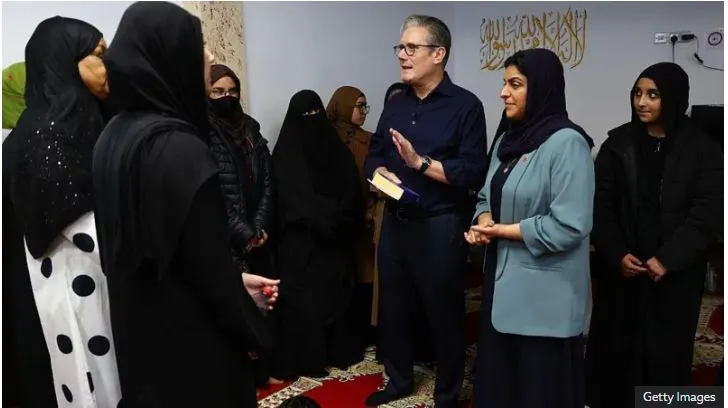 Keir Starmer, tenant le Coran dans une mosquée, avec à sa gauche son ministre de l’Intérieur, la musulmane Shabana Mahmood