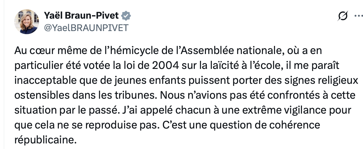 Depuis « on » a dû lui dire de la mettre en veilleuse. Il s’est contenté de dénoncer l’affaire sur son compte twitter et de protester auprès de Braun-Pivet : Ce à quoi nous avons assisté est une provocation. Il s’agit d’enfants qui sont instrumentalisés par des islamistes », estime Julien Odoul, député RN de l’Yonne.. Mais il n’a pas remis en cause la présence des filles voilées…