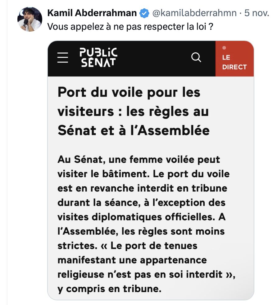 Et les dégénérés pro-voile, déchaînés, de sortir arguments, textes.. de tout bois pour essayer de prouver que, à l’Assemblée il serait tout à fait licite que les femmes portassent l’emblème de l’inégalité et de l’esclavage !