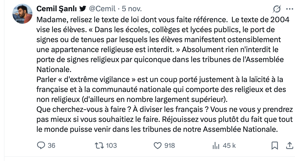 Question subsidiaire : comment se fait-il qu’à l’entrée à l’Assemblée personne de l’accueil n’ait réagi et agi pour refuser les provocatrices dans ce temps de la République et donc de la laïcité ? Ce temple des droits de l’homme et donc ceux de la femme, égale à l’homme, qui ne peut être contrainte de cacher ses cheveux parce que, même à 10 ans elle exciterait les hommes !