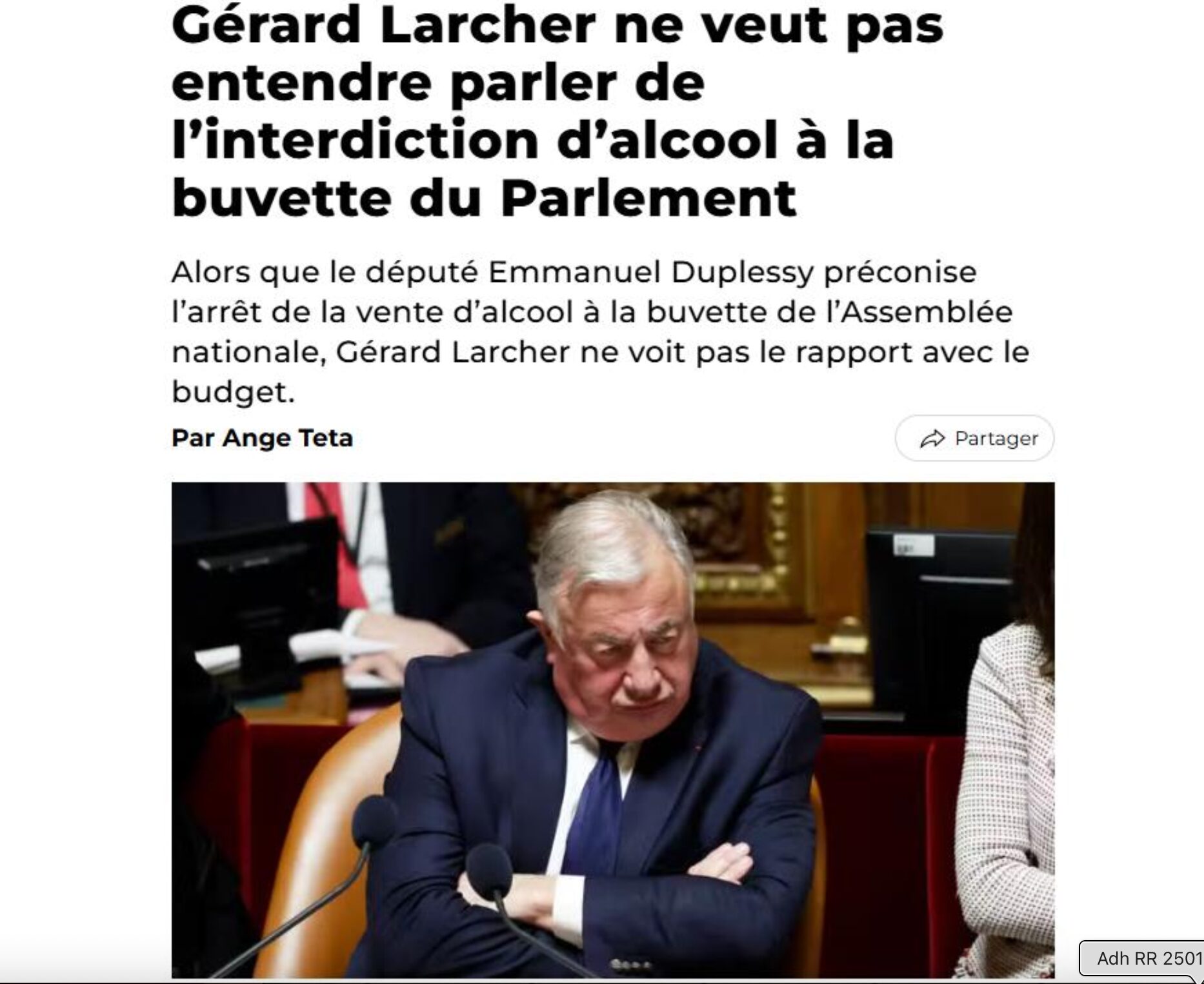 Larcher ne voit pas le rapport. C’est sûr que quand on a une cantine 5 étoiles, que le menu à la carte est payé 15 € au lieu de 200 €, et que c’est le contribuable qui paye le différentiel, on ne voit pas grand-chose effectivement. Tout comme à l’assemblée, je doute qu’ils boivent du whisky de marque distributeurs. Plutôt du pur malt millésimé à 200 € la bouteille minimum.
