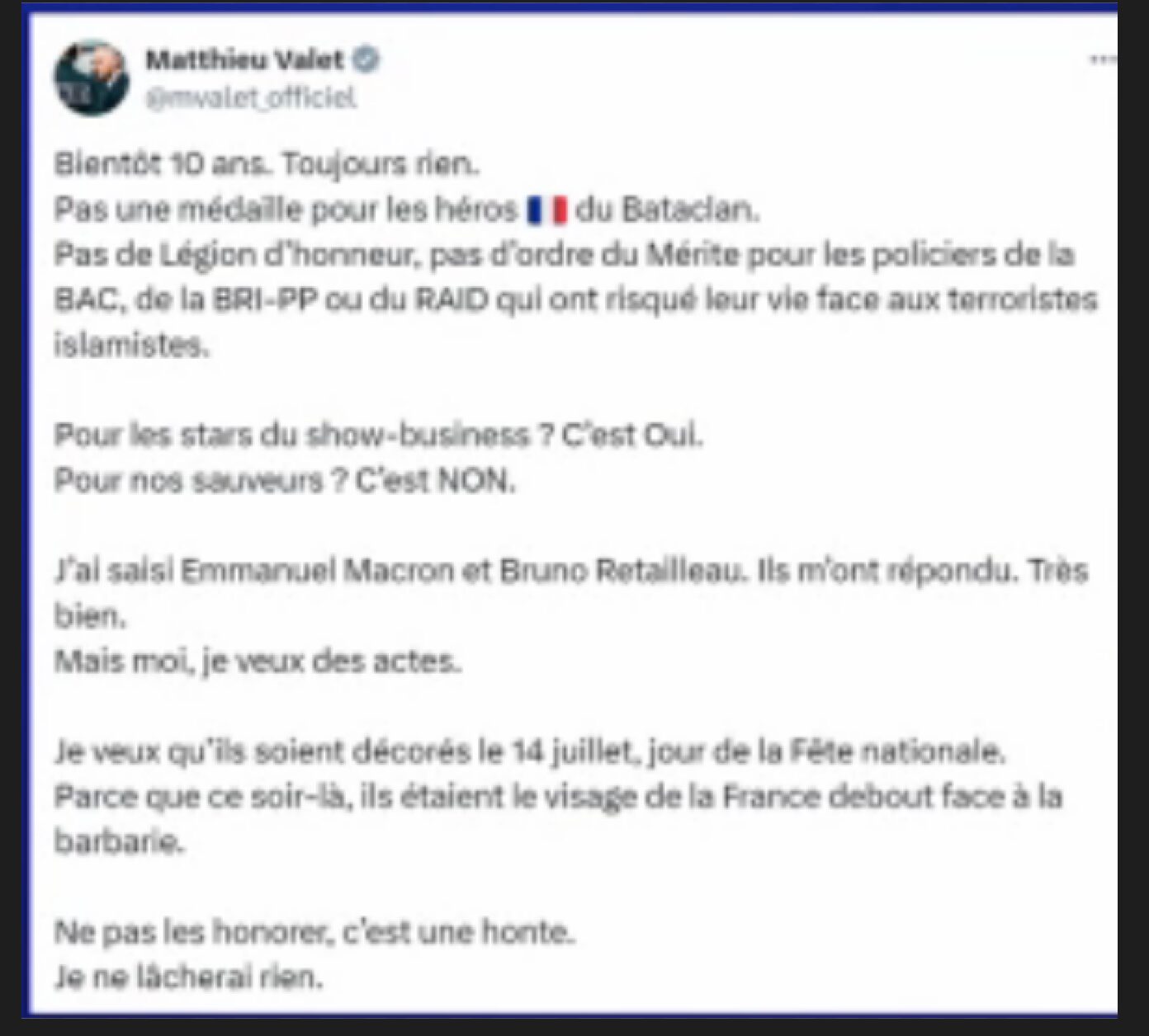 Savez-vous que nombre de policiers et autres membres des forces n’ont toujours pas reçu la médaille ô combien méritée pour les risques pris en sauvant des vies lors du Bataclan ! Il y a 10 ans !!! Ou même des particuliers ayant sauvé un vie au risque de perdre la leur !
